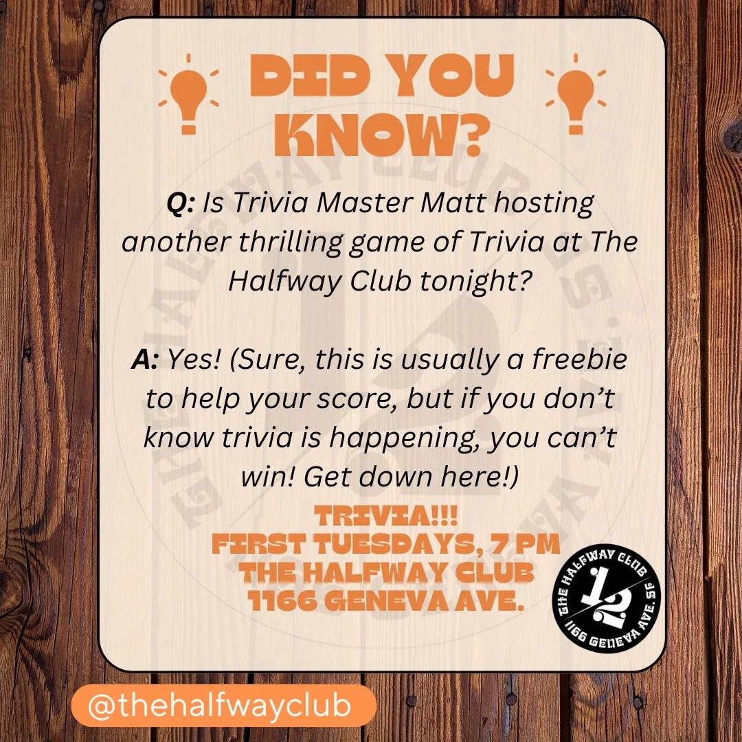 The Halfway Club hosts regular entertainment programming, including Tuesday Night Trivia at 7:00p, Jazz Happy Hour every Friday from 6:00 - 9:00, Patio Concerts, DJ Sets and other fun! Keep an eye on our social media for updates.